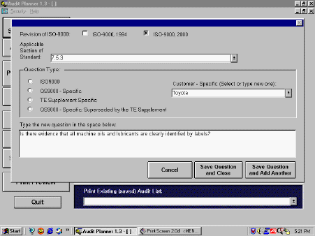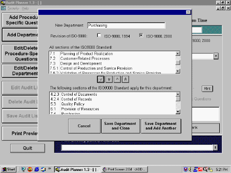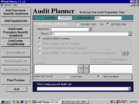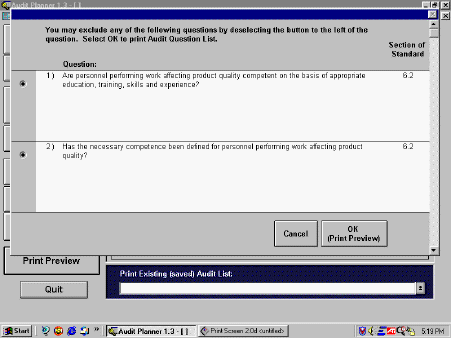 selecting 'Print Preview' a menu of questions for the selected section of the standard
